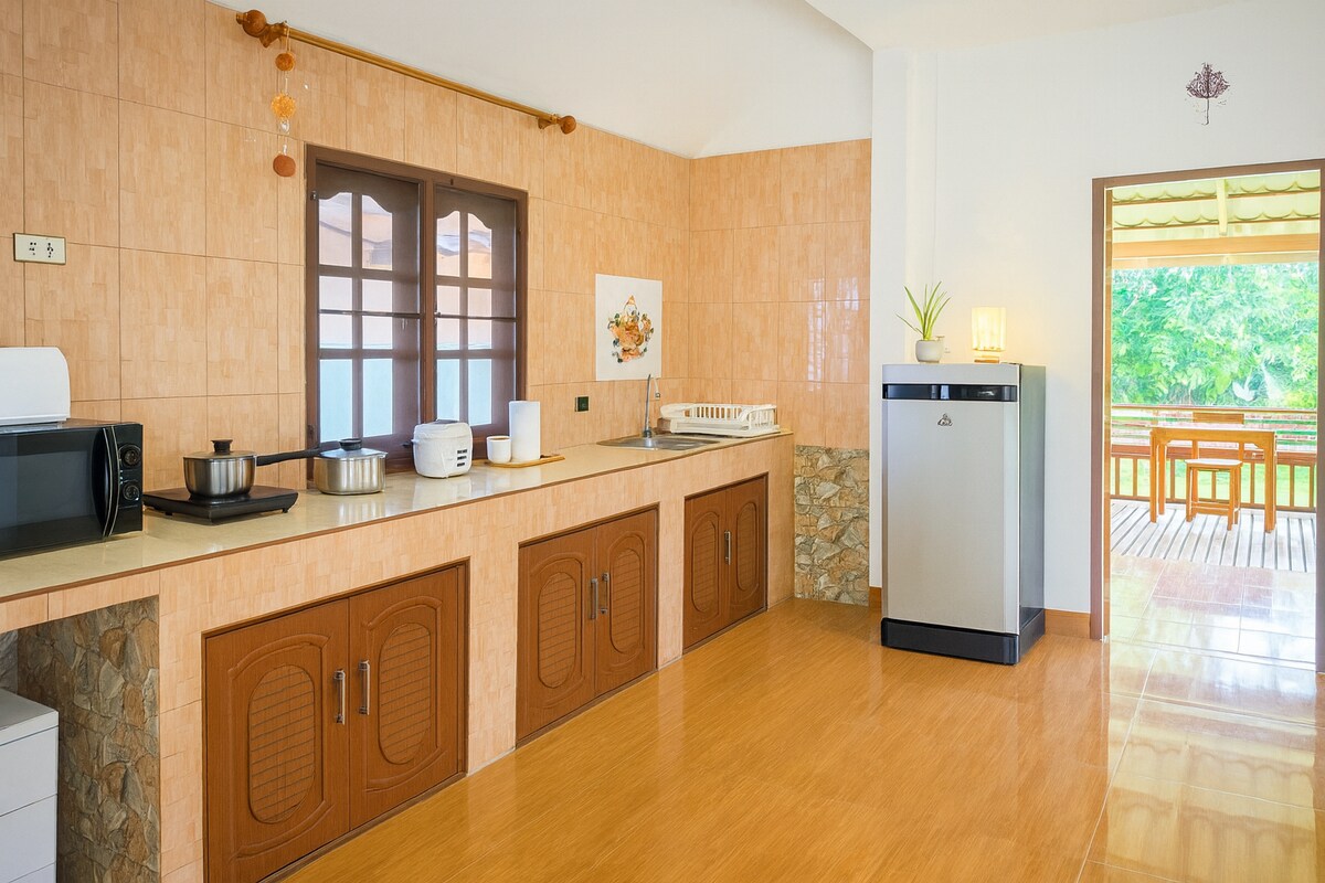 ένα λιτό ξύλινο μπανγκαλόου σε ταϊλανδέζικο στιλ σε έναν ήσυχο κήπο, με μια ευρύχωρη βεράντα για αργά πρωινά και ήρεμα βράδια. απλό, ευάερο και περιτριγυρισμένο από πράσινο. Βρίσκεται σε μια ήρεμη περιοχή αλλά πολύ κεντρική — σε κοντινή απόσταση με τα πόδια από παραλίες, καφετέριες και τοπικά εστιατόρια. Το μπανγκαλόου φιλοξενεί 1–2 επισκέπτες με ένα διπλό κρεβάτι και είναι δροσερό με ανεμιστήρα (χωρίς κλιματισμό), προσφέροντας έναν πιο αργό, πιο φυσικό τρόπο ζωής.