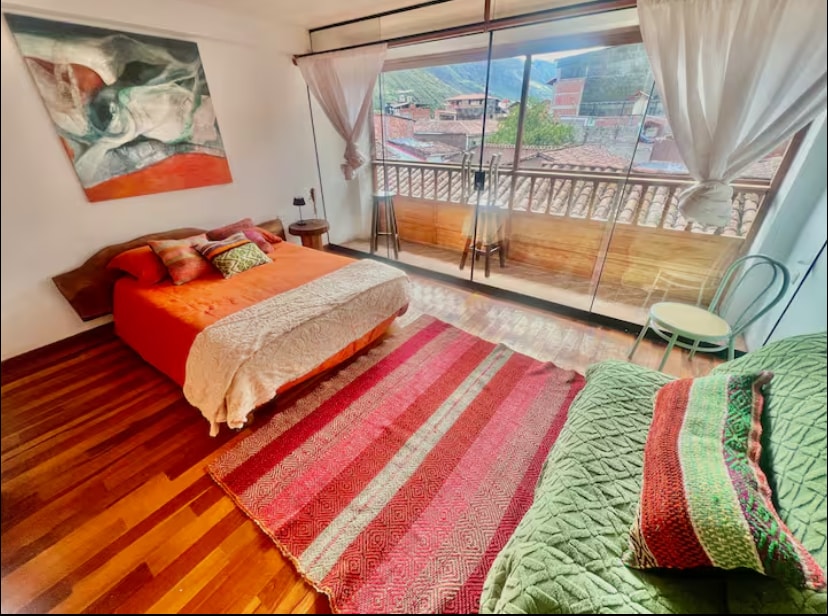 Spacious, thoughtfully decorated, second floor unit with stunning mountain and river views and sounds; 7 minute-walk from downtown Pisac. Comfortable living room with office and dining areas. Beds have pillowtop mattresses, memory foam and microfiber pillows, and alpaca blankets. Complete kitchen. Enclosed common area patio with kitchen and bathroom. Incredible original murals and artwork inside and outside by renowned Shipibo artists provide energetic and spiritual activations.