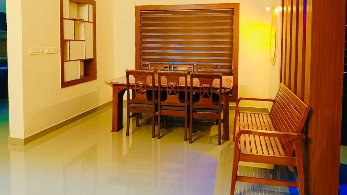Stylish 2BHK first-floor apartment in Kozhikode with exclusive access to the entire floor. Features 1 AC master bedroom overlooking a garden, 1 non-AC bedroom, fully equipped kitchen, living area, smart TV, Wi-Fi, washing machine, RO water purifier, and dedicated parking. Ideal for a peaceful stay. IDs required for check-in; no self-check-in. Bachelor groups above 4 not accommodated.