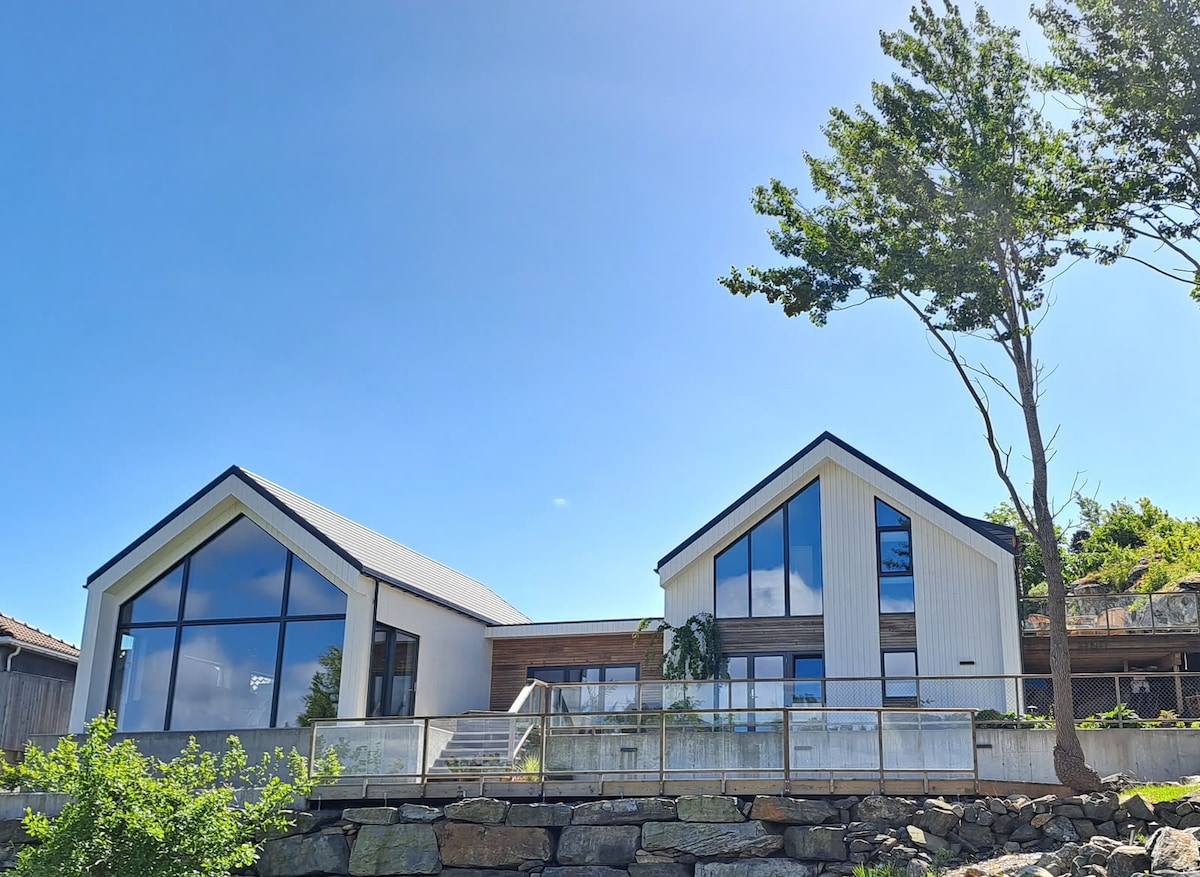 Μοναδική βίλα σχεδιασμένη από αρχιτέκτονα με εξωτερική πισίνα, 3 κουζίνες, 4 μπάνια, 3-4 σαλόνια και σταθερά μοντέρνες και ζεστές επιλογές διακόσμησης. Κουζίνες και μπάνια με εξαιρετικό εξοπλισμό. Εδώ θα βρείτε ηρεμία, αλλά σε απόσταση ποδηλασίας από το κέντρο του Kristiansand και το Dyreparken. Μπορεί να φιλοξενήσει έως και 16 επισκέπτες! Πάρκινγκ στην ιδιοκτησία και υπέροχοι εξωτερικοί χώροι. Κοντά στο δάσος και τη λίμνη, και η ένωση πηγαδιών έχει μια αποβάθρα σε απόσταση 4 λεπτών με τα πόδια. Η πλακόστρωση/εξωτερικός χώρος γύρω από την πισίνα θα ολοκληρωθεί στα τέλη της άνοιξης/καλοκαιριού του 2025.