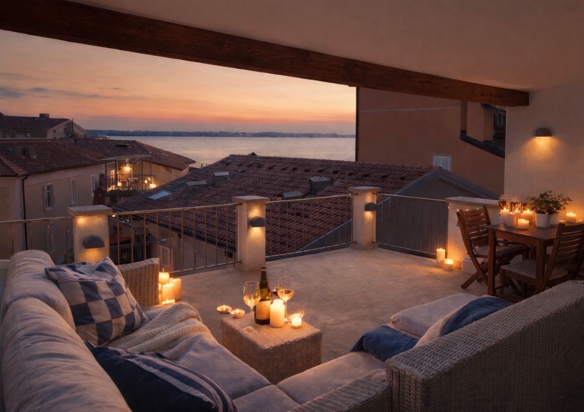 The location of the property has an exceptional position with the terrace on the roof. On the balcony of rising and setting sun, you could admire an infinte 360° view of outstanding beauty over Piran and sea. It has open wide space with kitchen, a living room with sofa, a bedroom with comfortable double bed, a bathroom with a shower – bath and toilet. It is a romatic ambient, stylishly decorated, an ideal choice for two persons in love. It makes a feeling of spaciousness and brightness.
