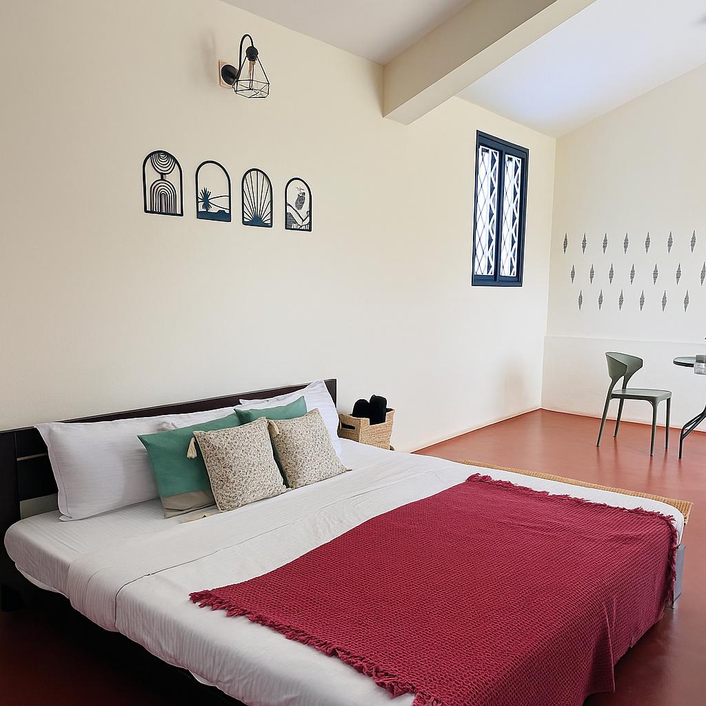 Your stay includes: ❄️ Air-conditioned studio with a modern bathroom 🍳 Fully equipped kitchenette with induction, utensils, pans & pots ☕ Coffee machine + tea/coffee essentials 🌐 Unlimited Wi-Fi 🥂 Welcome drinks & snacks on arrival 🅿️ Safe parking & private working space 🌺 Spacious lawn for relaxation 📚 Extensive library & board games 🧺 Washing machine, clothes rack & iron