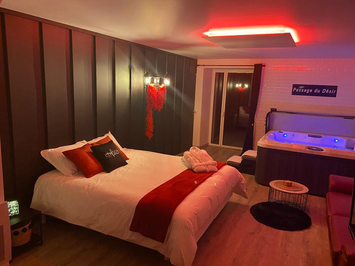 Απολαύστε 10% στην τιμή από 2 διανυκτερεύσεις στο L'Evasion. Συμπεριλαμβάνεται πρωινό. Δωμάτιο με πραγματικό *τζακούζι (όχι μπανιέρα) ιδιωτικό για μια ρομαντική και άτακτη στιγμή αφιερωμένη στην ευημερία. Μοντέρνα διακόσμηση, τακτοποιημένη και οικεία. Μπορούμε να προσφέρουμε επιλογές όπως έναν δίσκο απεριτίφ, ένα ρομαντικό κουτί, μπουκάλια κρασί, σαμπάνια... *Το νερό από το τζακούζι αλλάζει μετά από κάθε ενοικίαση.