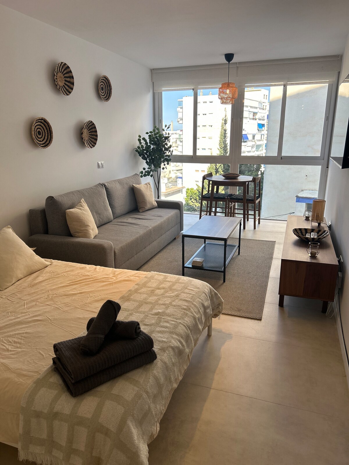 Ευρύχωρο 1 υπνοδωμάτιο με μεγάλη βεράντα. Χρήση πισίνας (εποχιακό άνοιγμα), γήπεδο τένις, κήποι και άμεση πρόσβαση στην παραλία. Κλιματισμός/θέρμανση, έξυπνη τηλεόραση, ηχείο μουσικής με bluetooth και WiFi με οπτικές ίνες. 5 λεπτά με τα πόδια από το κέντρο του Torremolinos και τον σιδηροδρομικό σταθμό για το αεροδρόμιο της Μάλαγα.
