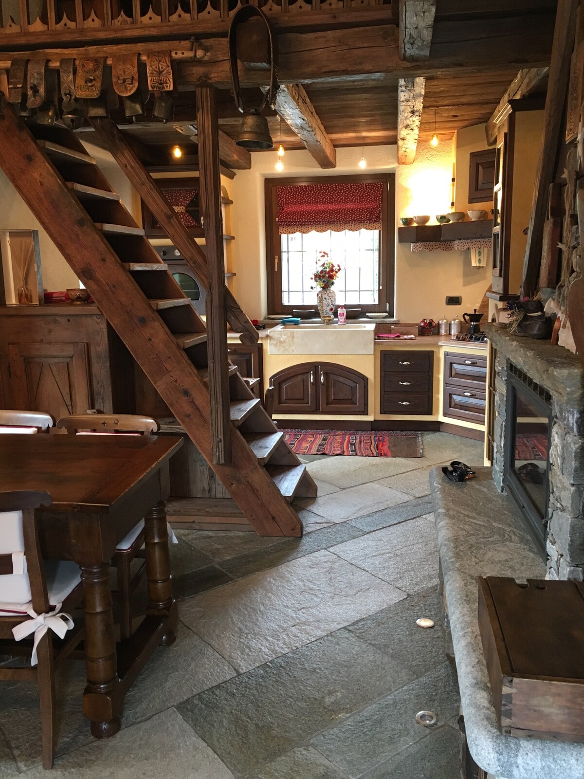 Βουνά των Άλπεων. Ιταλία. Κοιλάδα Aosta. Ένα ξυλόσπιτο σε ένα μικρό χωριό στα 1600 μέτρα,στην ηρεμία των λιβαδιών, των αγελάδων και των βουνών που βόσκουν. Χιόνι (συνήθως) το χειμώνα. Ένας χώρος της καρδιάς, ανακαινισμένος με αγάπη, διατηρώντας τα αρχαία δοκάρια της οροφής. Μια υπέροχη θέα από τα μεγάλα παράθυρα και μια ιδιαίτερη ηρεμία για όσους αναζητούν γαλήνη, ζεστασιά και χαλάρωση. Τα έπιπλα είναι πολύ ωραία: ξύλο πάνω απ' όλα, αλλά και πιο ζωντανά χρώματα και σύγχρονες ανέσεις. Ήσυχες εκδρομές, τόσο σε χιονοπέδιλα όσο και σε σκι.