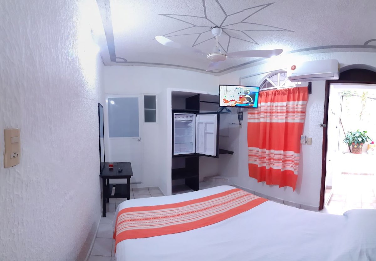 Άνετο και καθαρό δωμάτιο με δύο διπλά κρεβάτια, ντουλάπα για την τοποθέτηση αποσκευών, ξεχωριστό μπάνιο, δύο ανεμιστήρες οροφής, μίνι κλιματισμό και μπαλκόνι με θέα στον κεντρικό δρόμο για κλιματισμό ή κάπνισμα, επιπλέον βρίσκεται στο κέντρο του Bahías de Huatulco, στην πλευρά του πάρκου με τις γλάστρες, επομένως έχει πρόσβαση σε διάφορες παροχές όπως πλυντήριο, καταστήματα, εστιατόρια, σουβενίρ, δημόσιες συγκοινωνίες κ.λπ.