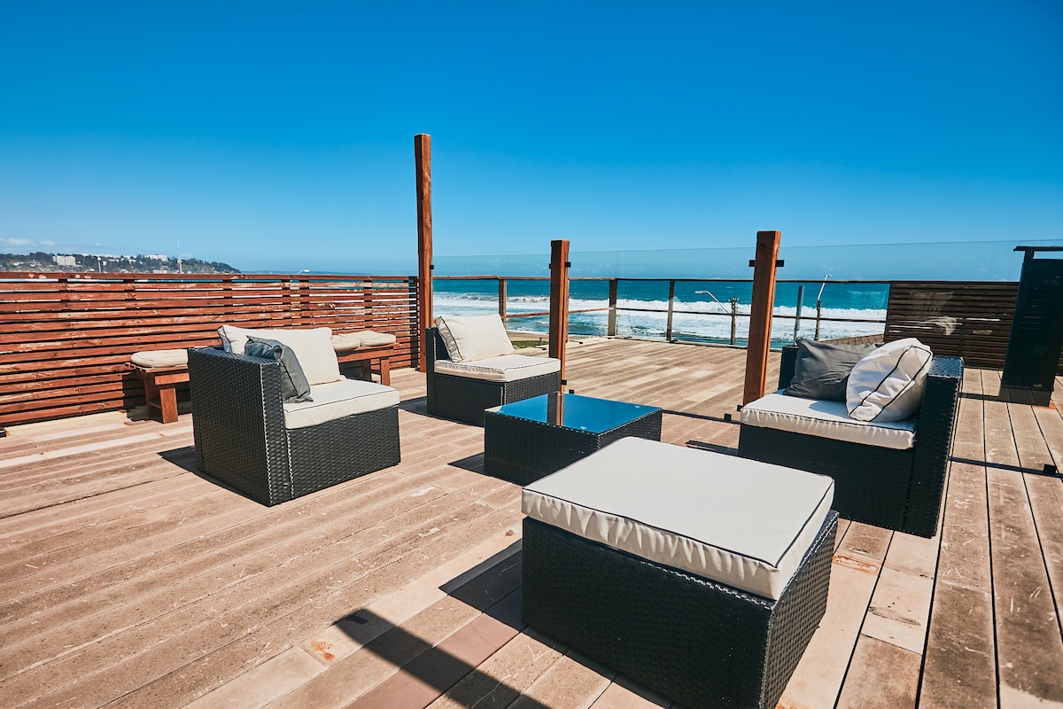 Lindísima, acogedora y amplia cabaña frente al mar en el mejor lugar de Maitencillo (2 horas de Santiago) muy bien equipada, se pueden hospedar hasta 9 personas cómodamente, condominio con piscina, quincho y estacionamiento privado. Terraza con vista al mar, living en terraza y playa en frente sin tener que cruzar una calle! Para disfrutar del mejor atardecer o pisco sour mirando a los niños sin que nadie interrumpa!! Condominio familiar se prohíben las fiestas!! Solo se arrienda por Airbnb.