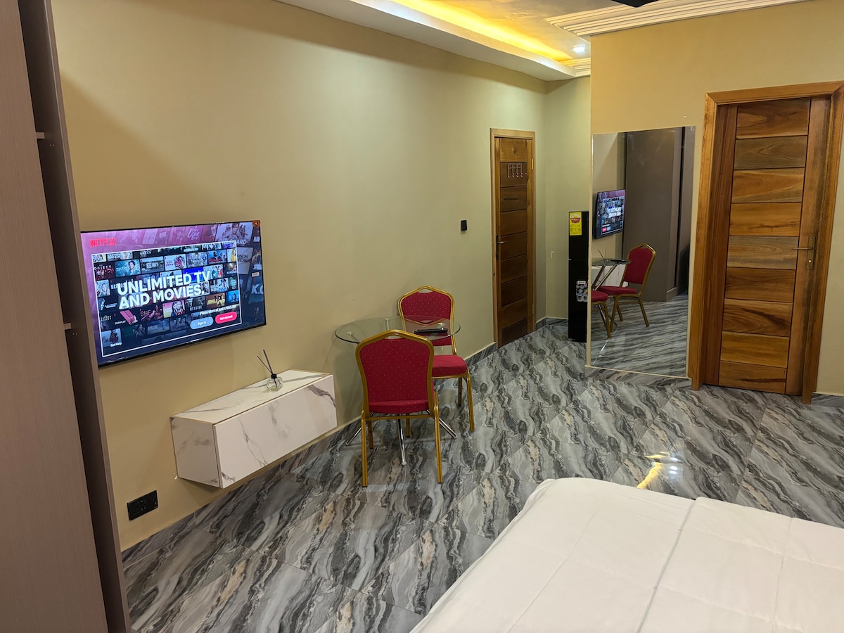 Luxurious, newly built, spacious one bedroom ensuite apartment for short & long term rent. The house is located in a prime part of North legon. 9.5km from Kotoka international Airport and 1.5km away from University of Ghana, Atlantic Mall, Palace Mall, Legon botanical garden, the apartment is close to everywhere. The ensuite room comes with a queen size bed, orthopaedic mattress & pillows for sound sleep. The smart apartment comes with a cctv cameras, ideal for comfort and safety living.
