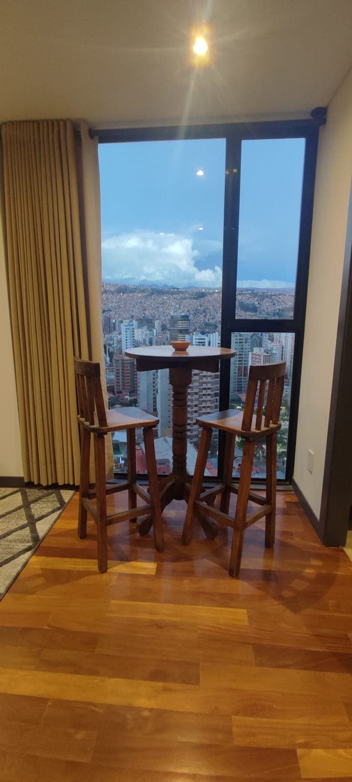 Νέο διαμέρισμα, ευρύχωρο, σε ψηλό όροφο και πολύ φωτεινό. Ιδανικό για ξεκούραση ή επαγγελματικά ταξίδια. Διαθέτει ένα υπνοδωμάτιο με ντουλάπα, δύο πλήρη μπάνια, εξοπλισμένη κουζίνα και μεγάλο σαλόνι-τραπεζαρία με υπέροχη θέα. Βρίσκεται σε ασφαλή περιοχή, κοντά σε καφετέριες, εστιατόρια και σούπερ μάρκετ, με εξαιρετική σύνδεση με τα μέσα μαζικής μεταφοράς. Αν προτιμάτε να περπατάτε, είναι ιδανικό για να μετακινείστε με ευκολία. Απολαύστε τη Λα Πας με άνεση, στιλ και ζεστασιά. Ο άνετος χώρος σας σάς περιμένει!