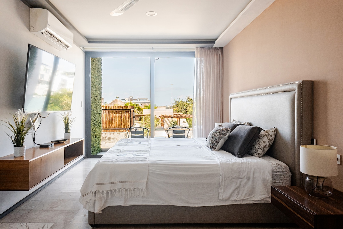 Seaside Escape: Rooftop Studio with Stunning Views 🌊 Experience the best of Playa! This modern rooftop studio offers breathtaking ocean views and a fresh Caribbean breeze. Located in the exclusive hotel zone (next to Hyatt Vivid), you’re steps from 5th Ave. Relax on your spectacular private terrace, featuring a secluded outdoor tub (ambient temp) overlooking the sea—perfect for couples! ⚠️ Note: Access involves 16 stairs; not suitable for guests with mobility impairments.