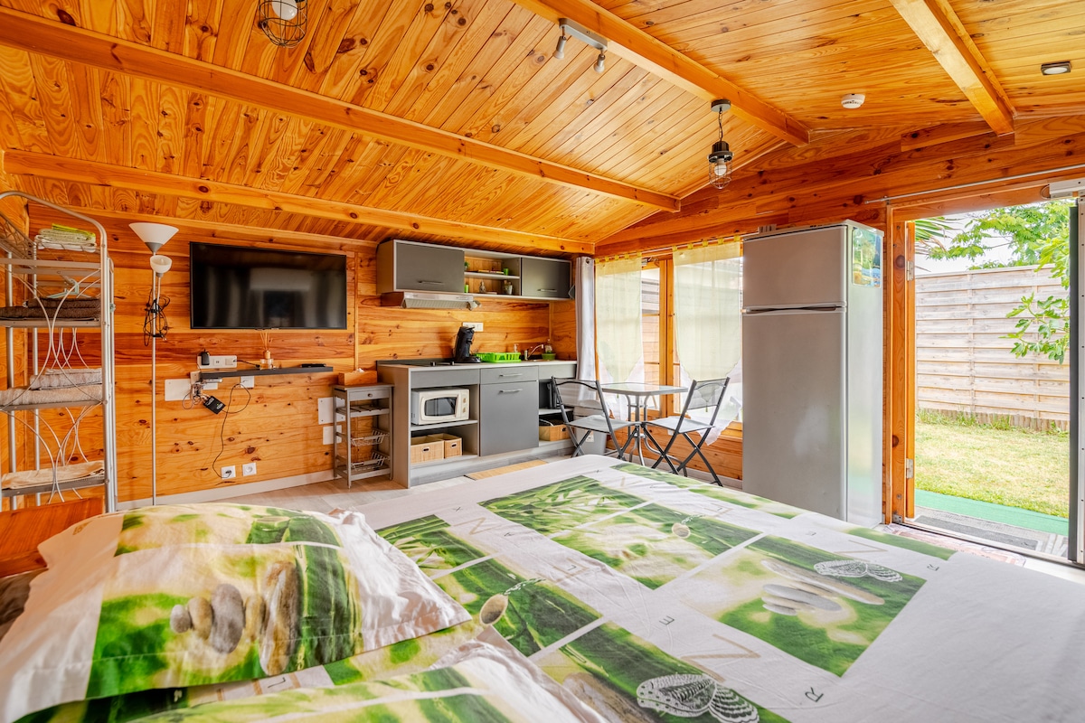 Cabanon climatisé de 20m² + parking voiture sur la propriété entièrement clôturée, privée et sécurisée. Situé à 10 minutes du lac par la piste cyclable et à 10 min en voiture de La Teste. Multitudes d’activités sont organisés…nous vous donnerons les bons tuyaux ! Un lieu idéal pour ceux qui s'intéressent : lacs, randos forêt, sports aquatiques…il est possible de rejoindre les plages de l’Océan à travers la forêt. Une dépendance adaptée pour 2 pers, mais il est possible d' accueillir un bébé.