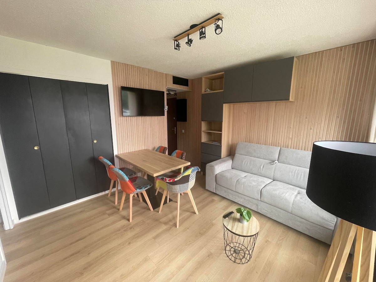 Άνετο και ζεστό στούντιο για 4 άτομα στους πρόποδες των πλαγιών. Προσφέρει θέα στα βουνά. Στούντιο 22m² με κλειστή κουζίνα, μπάνιο με ξεχωριστή τουαλέτα. Κρεβάτια: 1 κρεβάτι μεζονέτα 2 θέσεων και ένας καναπές-κρεβάτι 2 θέσεων στο κύριο δωμάτιο με τηλεόραση επίπεδης οθόνης. Ένα μπαλκόνι συμπληρώνει το κατάλυμα. Στούντιο ιδανικά τοποθετημένο, στους πρόποδες των πλαγιών και των τελεφερίκ και κοντά σε όλες τις ανέσεις, και διαθέτει έναν κλειστό χώρο για τα πέδιλα του σκι.