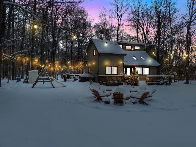 A stunning chalet ideally situated in the Pocono mountains. Your destination for a weekend escape or a longer stay all year round! Outside one can enjoy a natural setting in a beautiful 1-acre private wooded property, hot tub, two fire pits, a deck for morning coffee, or a delicious BBQ. Our home offers a tranquil interior atmosphere and home is conveniently located near all Pocono Mountains' seasonal activities. Whether you want to unwind or recharge, our home provides the perfect retreat.