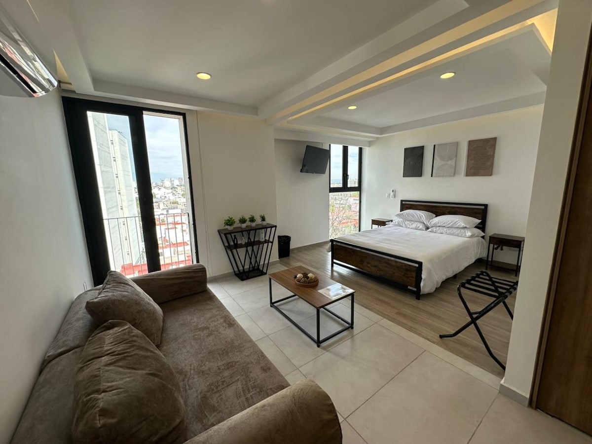 Απολαύστε τα όμορφα ηλιοβασιλέματα της Γκουανταλαχάρα σε μία από τις ασφαλέστερες γειτονιές, με τις καλύτερες συνδέσεις και τη μεγαλύτερη γαστρονομική προσφορά της πόλης. Αυτό το μοντέρνο στούντιο φιλικό προς τα κατοικίδια, είναι εξοπλισμένο για σύντομες ή μακρά διαμονή. Διαθέτει μια εξαιρετική βεράντα για να υποδεχτείτε τους επισκέπτες σας. Είναι ένα ολόκληρο διαμέρισμα με ένα κρεβάτι queen, τραπεζαρία, πλήρως εξοπλισμένη κουζίνα, ιδιωτική βεράντα, πλυντήριο ρούχων, σίδερο, τηλεόραση, διαδίκτυο (100 mb) και χρηματοκιβώτιο. Βρίσκεται στον τρίτο όροφο και δεν υπάρχει ασανσέρ.