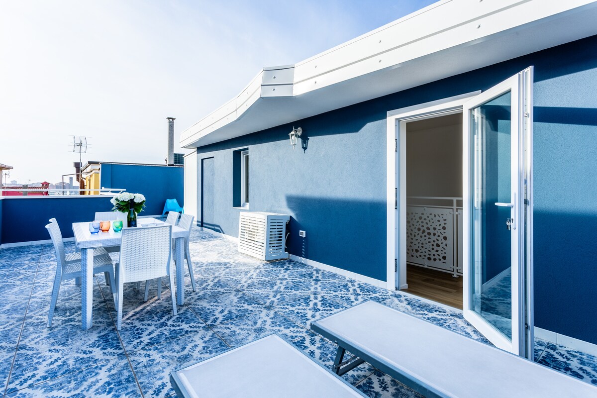 80m2 apartment on the third floor overlooking the historic center and partially on the Vena canal, 150 meters from the boats to / from Venice, with air conditioning. Consisting of a double bedroom, a single bedroom, a living room with a convertible sofa, a brand new kitchen, a bathroom, and with a terrace from which you can also see the lagoon and the port. The terrace has tables, chairs and umbrella to enjoy breakfasts, aperitifs, dinners, or even just sunbathing in complete relaxation.