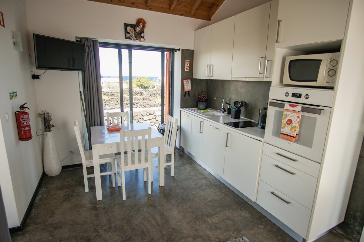 Muita luz, vista espantosa sobre o mar e onde se vê na sua plenitude a ilha de São Jorge. Primeira linha de Mar! Vista para a montanha do Pico, o ponto mais elevado de Portugal. Casa muito confortável, utilizámos madeira da ilha no seu interior. Uma muito boa localização entre a Madalena e São Roque e perto do Aeroporto. Cozinha bem equipada. Relaxe, leia, observe o mar, os barcos e a Montanha também.
