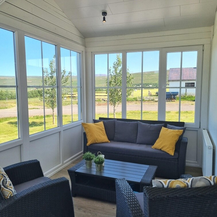 The apartment is a part of the house complex at Sunnuhlíð, a farmland close to the town of Akureyri. The apartment is perfect for four adults, two couples or families traveling on their own. Guests can enjoy the beautiful view of Eyjafjörður and Akureyri. Additional fee for more than two guests is € 18 per guest, per night.
