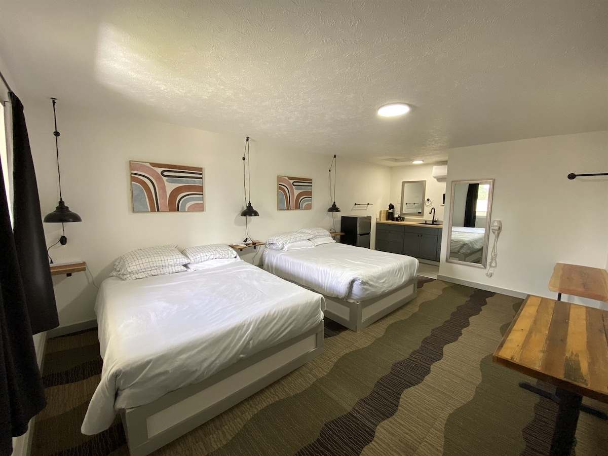 Welcome to the Outdoors Inn, our tiny, totally renovated, family-owned boutique motel just 1 mile from downtown Sandpoint. Our cozy & compact queen room was designed to evoke the spirit of North Idaho: modern but rustic, rugged but comfortable. With 100% cotton linens, artisan coffee, locally-forged details, and right-outside-your-door parking, this room offers the perfect blend of homey comfort and hotel convenience (no hidden fees, and we'll never ask you to strip the bed!)