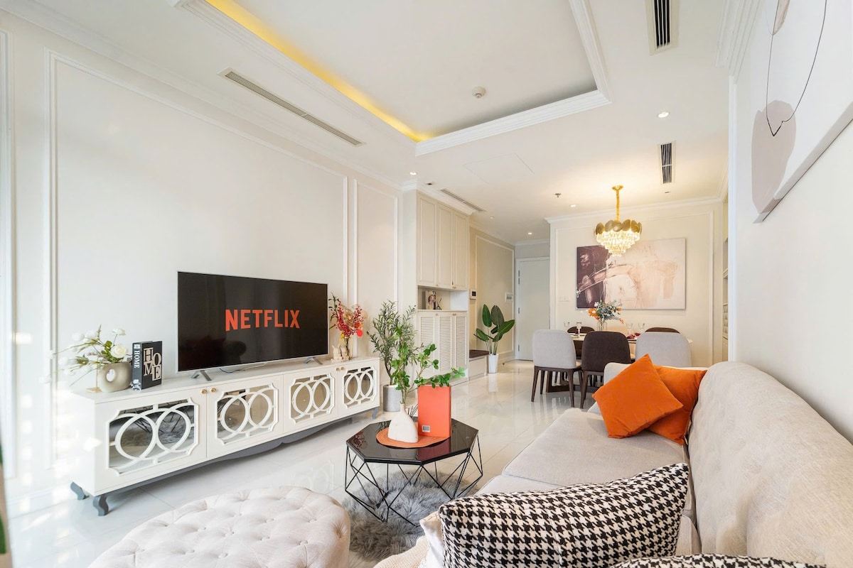 Welcome to our newly launched apartment located in Central 3 – one of the building in the Vinhomes Central Park complex The apartment features a modern and stylish design, with an open view that's not blocked by any surrounding buildings It includes two queen-size beds. The master bedroom is equipped with a projector, perfect for "Netflix and view" The apartment comes with a fully equipped kitchen, iron, hair dryer, and other essentials. Fresh towels can be replaced free of charge upon request