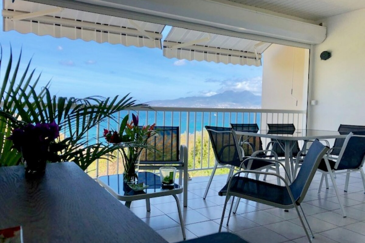 Une vue imprenable sur l'horizon et la baie de Fort De France, vous trouverez calme et tranquillité dans ce bel appartement refait à neuf climatisé, composé d'un chambre, d'un salon, cuisine américaine et d'une salle d'eau avec WC. Comme couchages, un lit 160 dans la chambre et un bon canapé convertible. Après une journée plage ou de découverte de la Martinique, prenez le temps de vous relaxer sur la terrasse avec une vue mer juste époustouflante sur des transats très confortables.