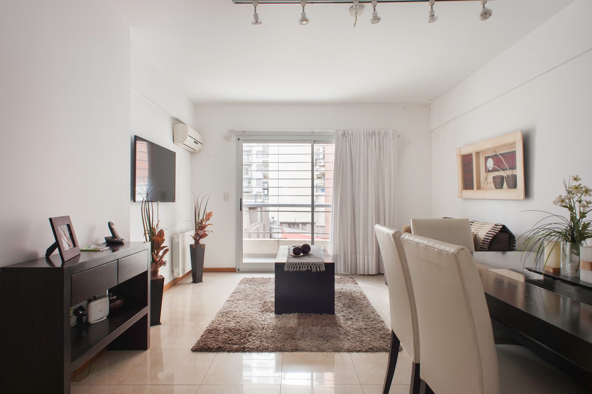 * Safe and peaceful area surrounded by shops of all kinds and quality restaurants nearby. * Bedroom with 55" SmartTV. Living room with available working area - table and chairs . * Fully equipped kitchen -Nespresso, Washer, Toaster, Fridge, Microwave. * Access to free street parking. * Close proximity to Embassies - Spain, Morocco, Saudi Arabia, Poland. * Easy access to Shopping Alcorta, Bosques de Palermo, Sanatorio Mater Dei, Museo MALBA.