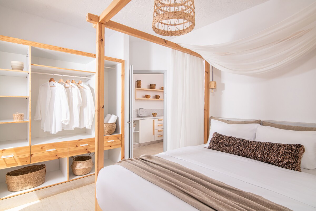 A modern and minimalistic suite combining the luxury style of the furnitures to make your stay a unique experience in Stalis. Only 1 min. walk by the beach and the main street where all the shops and restaurants exist. This one bedroom suite consists of a King size bed with anatomic mattress for a relaxing and deep sleep for your convenience. A big sofa, huge smart Netflix tv for your entertainment. Modern Kitchen and bathroom fully equipped with all necessary utilities to cover all your needs.