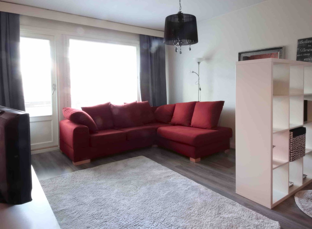 This two-room apartment has free parking and great connections to city center. Nearest bus stop is only 200 meters away. There are excellent outdoor activities nearby, but also a good wifi and Netflix when you feel like staying in. Within 500 meters, there are two grocery stores, a pharmacy and a pizzeria. Huhtasuo Disc Golf Park is 600m away. The soccer hall ”Huhtahalli” is 1km away. In winter, a ski trail leaves from the Kangaslampi activity park, 300m away. More info on ’Where you’ll be’⬇️
