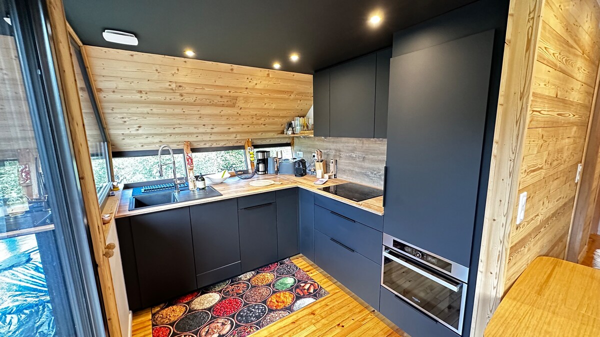 Pour une nuitée, un week-end ou la semaine, venez vous ressourcer dans une cabane chaleureuse en bois, sur pilotis et tout confort ! Vous profiterez d'une prestation para-hôtelière, le lit (queen size) est fait, les serviettes de toilette sont fournies, le ménage et la désinfection de la chambre sont inclus. La grande baignoire vous promet des moments de relaxation. L'espace cuisine vous permet d'être indépendant..