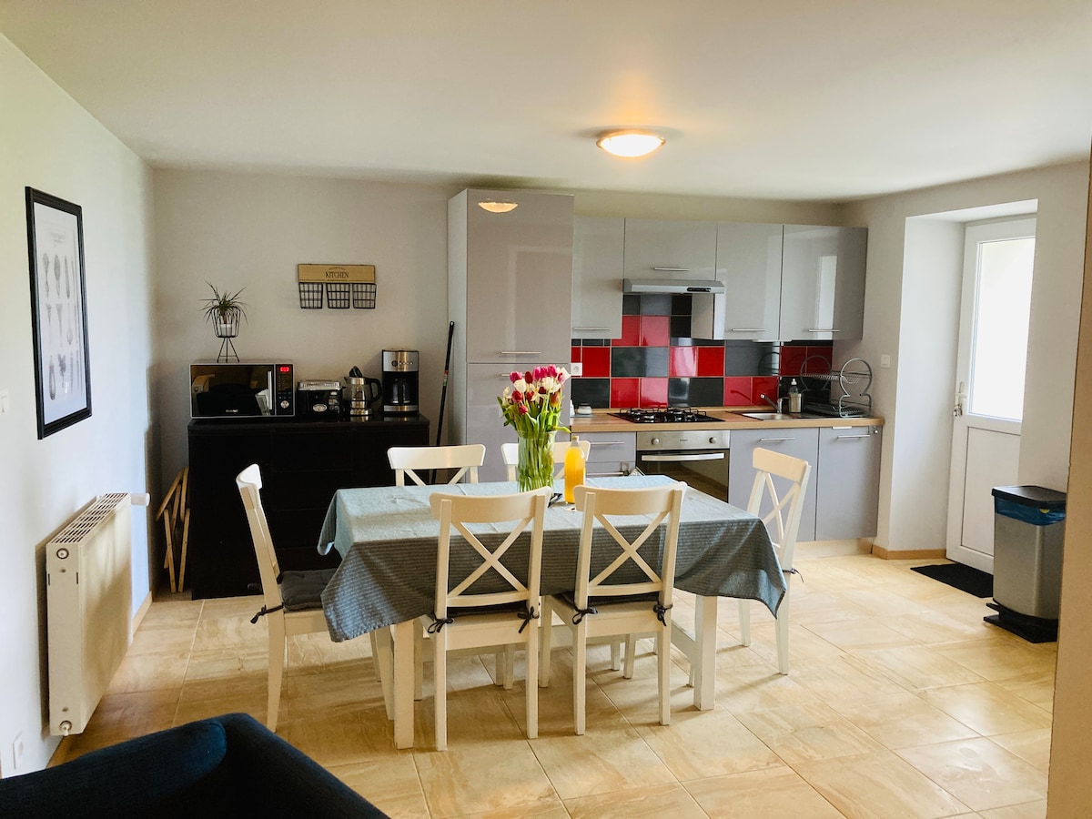 Σπίτι στην ύπαιθρο ιδανικό για να συναντηθείτε με την οικογένεια ή τους φίλους, σε ένα ήσυχο και γαλήνιο περιβάλλον. Αποτελείται από μια εξοπλισμένη κουζίνα (φούρνος, ψυγείο με καταψύκτη, βραστήρας, φούρνος μικροκυμάτων, τοστιέρα, καφετιέρα (tassimo) καθώς και αρκετές μικρές συσκευές), τραπέζι με επέκταση. Μπάνιο. Τουαλέτα. Μεγάλο σαλόνι με καναπέ-κρεβάτι. 2 υπνοδωμάτια (1 με διπλό κρεβάτι, 1 με διπλό κρεβάτι + μονό κρεβάτι). Πλυσταριό. Βεράντα στον μεγάλο κήπο χωρίς γείτονες. Εξοπλισμός για μωρά.