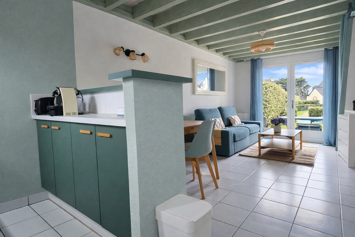 Το σπίτι βρίσκεται στην προκυμαία, στην Cote Sauvage de Quiberon. Είναι μέρος μιας πολυκατοικίας με 6 σπίτια με βεράντες. Επωφελείται από μια νότια έκθεση, έναν κλειστό ιδιωτικό κήπο, μια βεράντα όπου μπορείτε να γευματίσετε ενώ παρακολουθείτε τη θάλασσα. Έχετε επίσης πρόσβαση στον μεγάλο κοινόχρηστο κήπο και χώρο στάθμευσης. Η μεγάλη παραλία Quiberon απέχει 800 μέτρα. Θα βρείτε επίσης όλα τα τοπικά καταστήματα.
