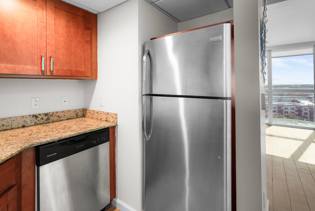Καλωσορίσατε στην πολυτελή απόδρασή σας! Απολαύστε τον τέλειο συνδυασμό άνεσης και κομψότητας σε αυτήν την Executive King Σουίτα με θέα στην πόλη, που βρίσκεται στην καρδιά του κέντρου του Φορτ Μάιερς. Αυτό το μοντέρνο διαμέρισμα 1 υπνοδωματίου διαθέτει ένα βελούδινο υπέρδιπλο κρεβάτι και έναν διπλό καναπέ-κρεβάτι, ιδανικό για ζευγάρια, επαγγελματίες ή μικρές οικογένειες. Απολαύστε θέα στην πόλη, πλήρως εξοπλισμένη κουζίνα και πρόσβαση σε πολυτελείς παροχές, όλα σε απόσταση λίγων βημάτων από τα καλύτερα εστιατόρια, καταστήματα και χώρους ψυχαγωγίας στο Φορτ Μάιερς.