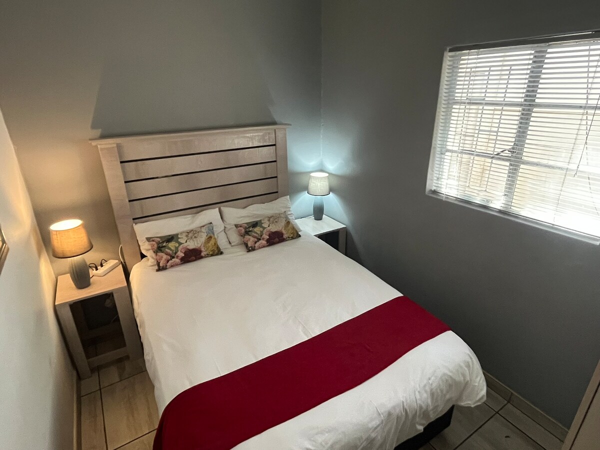 Σε κεντρική τοποθεσία, ιδιωτική μονάδα 1 υπνοδωματίου με ιδιωτικό μπάνιο, πλήρως εξοπλισμένη κουζίνα, σαλόνι, καθορισμένο χώρο εργασίας και ασφαλή χώρο στάθμευσης πίσω από μια πύλη με τηλεχειριστήριο. Το υπνοδωμάτιο διαθέτει ένα υπέρδιπλο κρεβάτι με λευκά αιγυπτιακά βαμβακερά σεντόνια, πάπια και ηλεκτρικό τραπεζάκι. Τηλεόραση επίπεδης οθόνης 42 ιντσών τόσο στο ευρύχωρο υπνοδωμάτιο όσο και στο ιδιωτικό σαλόνι με το πλήρες πακέτο DSTV. Οι επισκέπτες έχουν επίσης πρόσβαση σε δωρεάν Wi-Fi χωρίς κάλυμμα. Η πρόσβαση στη μονάδα γίνεται μέσω ενός ιδιωτικού χώρου "σκαλοπάτι".