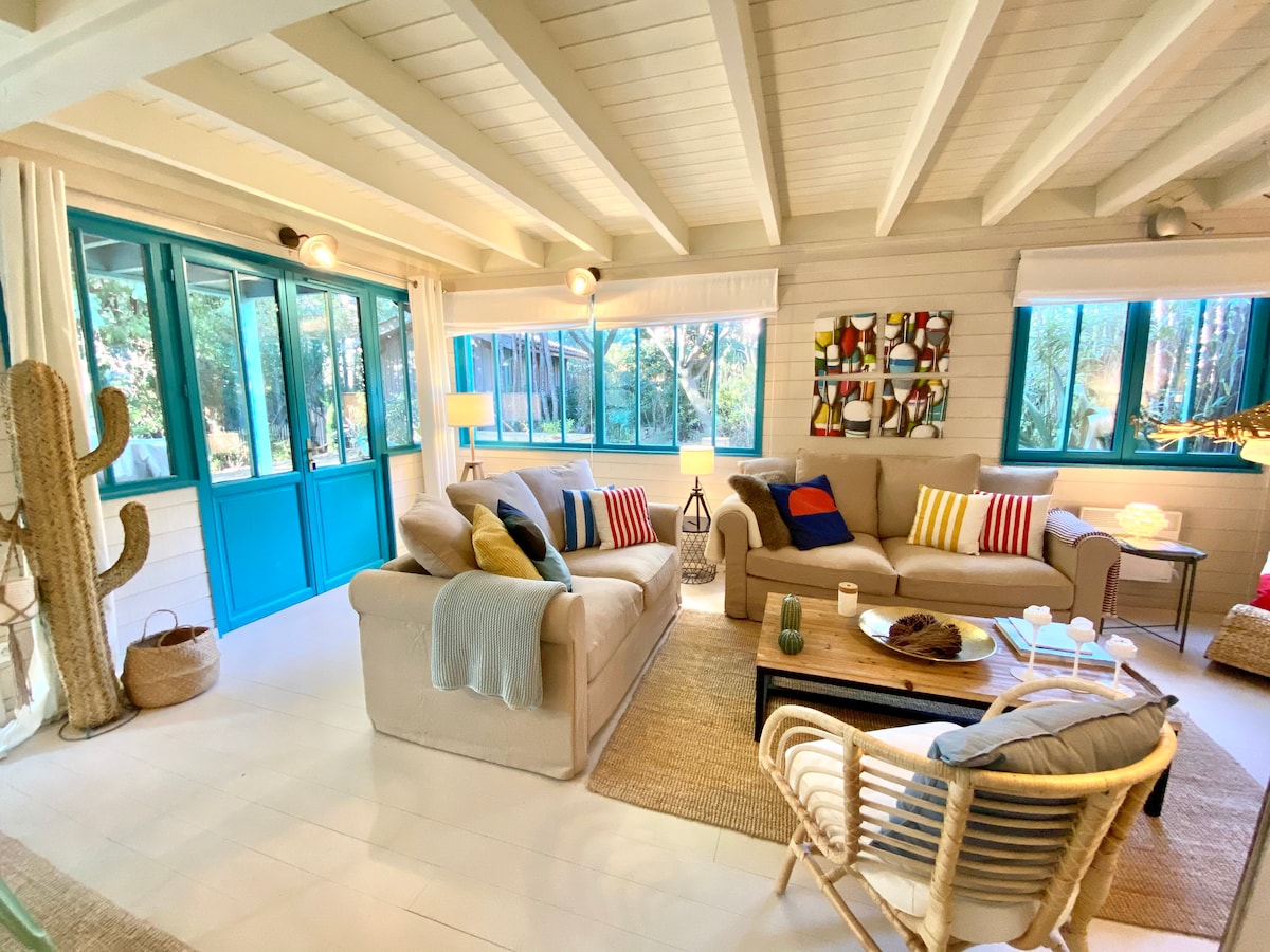 Ένα καταφύγιο γαλήνης με την παραλία στο τέλος του δρόμου, που αποτελείται από ένα υπνοδωμάτιο με 1 διπλό κρεβάτι, ένα σαλόνι (με καναπέ-κρεβάτι king size 160x200cm), κουζίνα, μπάνιο. Ξύλινο σπίτι 45m² που ανακαινίστηκε το 2015 και το 2017. Βεράντα 30m². Πλυντήριο πιάτων, πλυντήριο ρούχων, τηλεόραση, ψησταριά Weber, πλάντσα. Περιφραγμένος κήπος με κοινόχρηστο χώρο στάθμευσης. Μέγιστο 4 άτομα. Είμαστε δίπλα για να σας καλωσορίσουμε, να σας δώσουμε συμβουλές για να ανακαλύψετε καλύτερα τη χερσόνησο του Cap-Ferret, σεβόμενοι παράλληλα την ιδιωτικότητά σας.