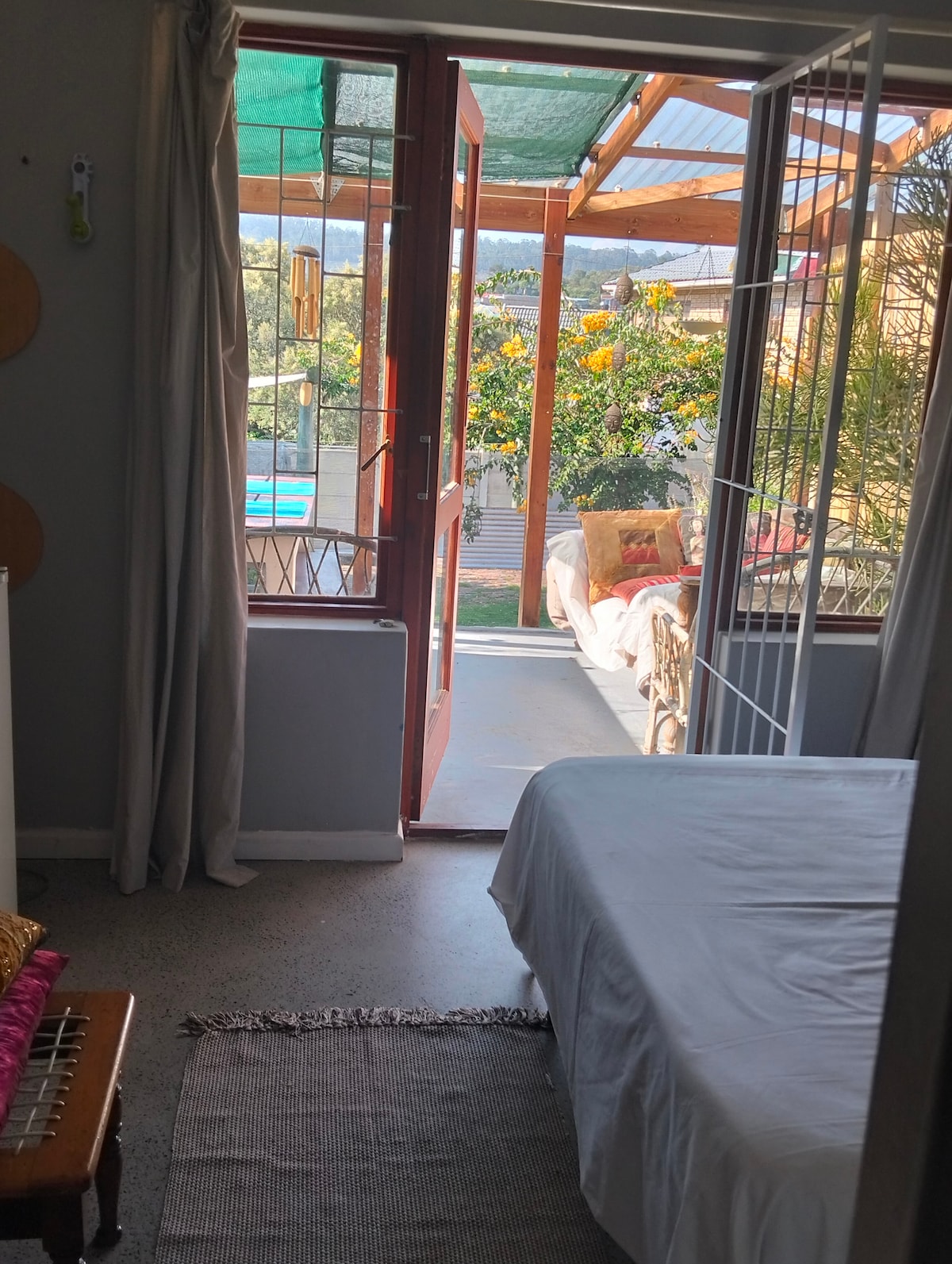 Private En-Suite room with separate entrance in secure estate. Parking for 1 car. Fridge, Coffee station and Microwave. Crockery and cutlery is changed daily or as required. No additional cooking facilities. Owners live in the main house. Thesen is a secure estate on the canals. Guests will be sent a link and are required to register online prior to arrival in order to facilitate biometric access to the estate. Easy walking distance to Thesen harbour Town, Knysna waterfront and the CBD.