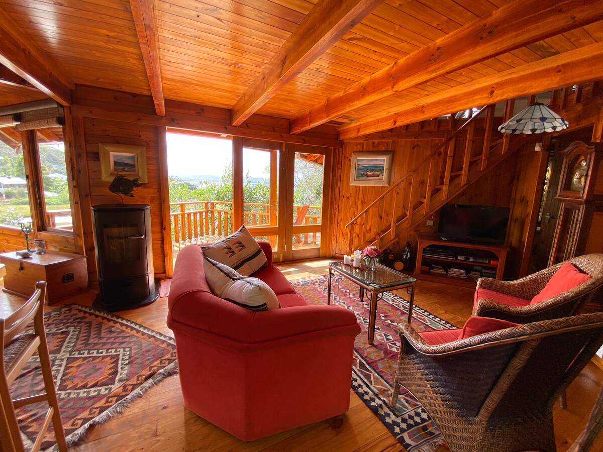 Θέα 180 μοιρών (ηλιακή ενέργεια για ασφάλεια) της εκπληκτικής λιμνοθάλασσας Knysna σε ήσυχη γειτονιά. Κορυφαία φινιρίσματα σε ένα νέο σπίτι! Υπέροχος κήπος και πισίνα. Ηλιόλουστη βεράντα για να απολαύσετε τη θέα και ένα τζάκι για να προσθέσετε ατμόσφαιρα και ζεστασιά στα πιο δροσερά βράδια. Τόσο κοντά στην πόλη, αλλά ήσυχο και ιδιωτικό. Braai/Μπάρμπεκιου για υπαίθριο μαγείρεμα και φαγητό τα πολλά όμορφα βράδια. Οι κριτικές από όλους τους επισκέπτες μας τα λένε όλα και το 75% των επισκεπτών μας είναι απαιτητικοί διεθνείς ταξιδιώτες.
