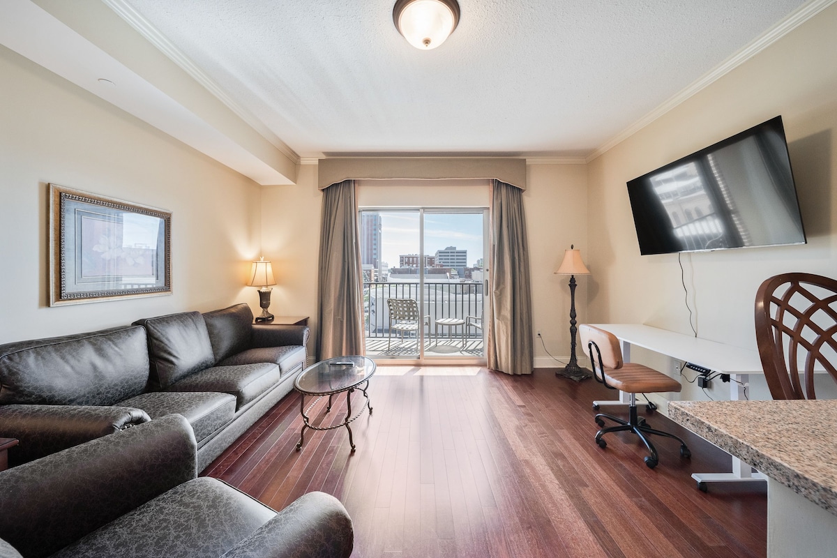 Stay in the heart of Tallahassee with unbeatable walkability to the Florida State Capitol, FSU, restaurants, and nightlife. This spacious studio offers second floor skyline and FSU fountain views from a private balcony, secure parking, and room for up to 3 guests — perfect for game days, business travel, or family getaways.