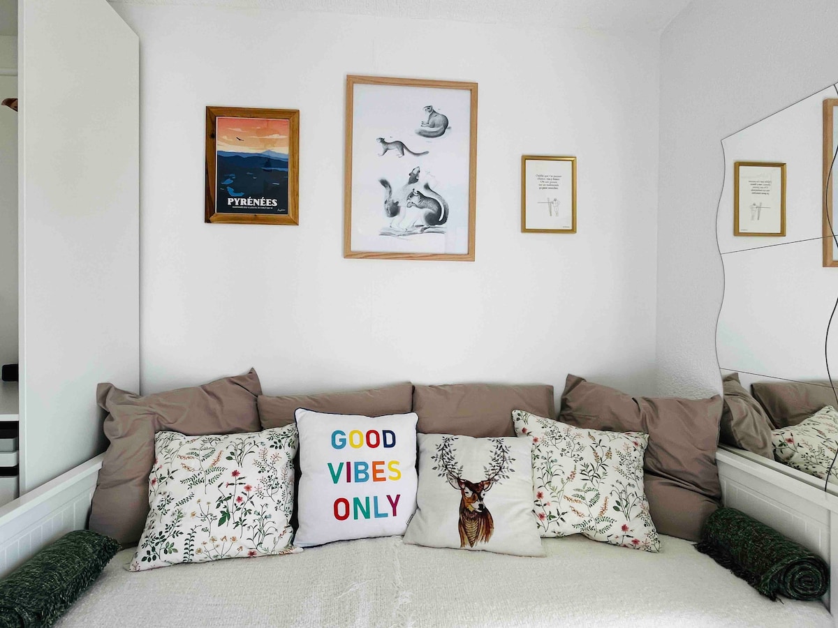 Χρειάζεστε ένα μέρος για να επαναφορτίσετε τις μπαταρίες σας, μην ψάχνετε πέρα από αυτό το ωραίο μικρό νοικιασμένο διαμέρισμα με γκαράζ στον τρίτο και τελευταίο όροφο μιας κατοικίας, που βρίσκεται στην καρδιά του θέρετρου Les Angles, είναι για εσάς! ΙΔΑΝΙΚΌ για ζευγάρια με/χωρίς παιδιά, αλλά προσέξτε ότι η επιφάνεια παραμένει μικρή και κεκλιμένη για το πάνω μέρος. Ευχαριστούμε να δείτε τις φωτογραφίες. WiFi 1 κύριο υπνοδωμάτιο με γκαρνταρόμπα. 1 κρεβάτι ξυλόσπιτου με κρεβάτι στον επάνω όροφο για 2 άτομα + 1 μονό κρεβάτι από κάτω.
