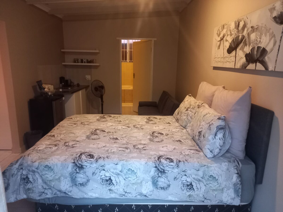 Come and relax in this calm and stylish space. Luxurious, safe and peaceful studio. Whether you're traveling for business or leisure, this is the perfect spot to feel at home. We've done everything with your comfort in mind. A full modern bathroom with bathtub and shower ; a kitchenette with everything to remind you of your home feel. Located in the beautiful suburb of Highway Gardens (Edenvale) , just 7Km from O. R. International Airport. Karaglen Shopping Centre is at walking distance.