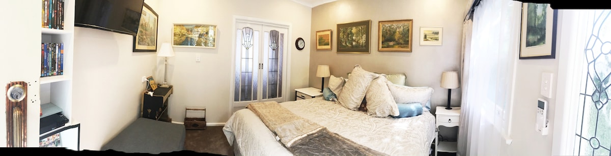 Our guest apartment is a peaceful, bright, private space with undercover parking and entry from the carport. Situated in a quiet street in walking distance from Wentworth Falls Lake, and easy drive to all the main sights of the Blue Mountains. We have a luxury bathroom with a fabulous shower with a heated floor. There are also comfy chairs in the sitting room/ kitchenette. Reverse cycle air conditioning will keep you warm in winter and cool in summer. Note: we’re not set up for small children.