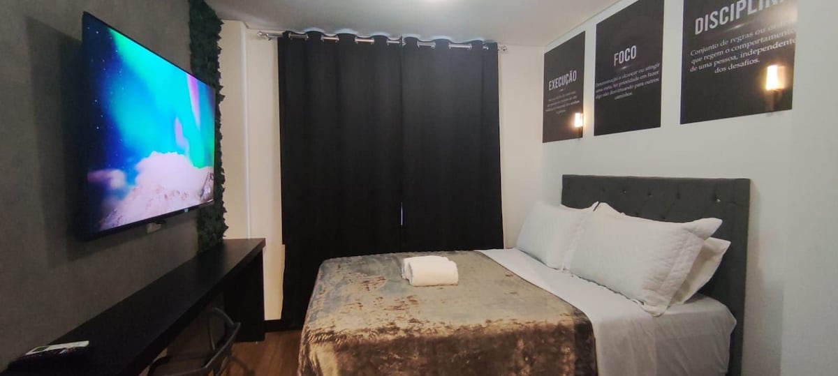Καλώς ήρθατε. Βρισκόμαστε σε προνομιακή τοποθεσία μπροστά από το εμπορικό κέντρο Curitiba, σε εξαιρετική τοποθεσία κοντά σε όλα, μπαρ, εστιατόρια, αξιοθέατα μεταξύ άλλων. Ιδανικό για εσάς που έρχεστε σε περιοδεία ή εργασία. Με γνώμονα την άνεσή σας, διαθέτουμε έξυπνη τηλεόραση, Wi-Fi, κλιματισμό, πλήρως εξοπλισμένη κουζίνα και επιλογή στάθμευσης (στο κτίριο). Το κτίριο διαθέτει θερμαινόμενη πισίνα (πρέπει να προσκομίσετε ιατρικό πιστοποιητικό), σάουνα, γυμναστήριο, βιβλιοθήκη με παιχνίδια και πλυσταριό. Όλα όσα χρειάζεστε.