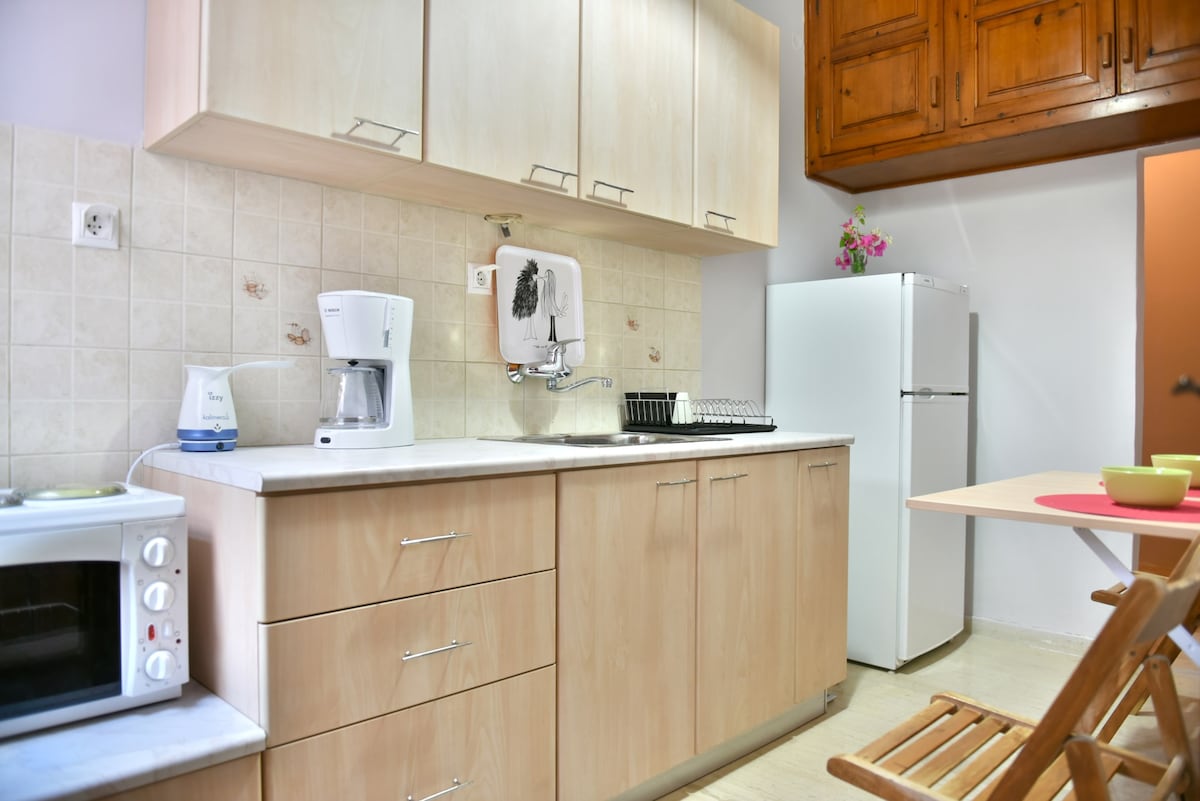 Διαμέρισμα 35μ² στον πρώτο όροφο με δική του είσοδο ανακαινίστηκε πλήρως πρόσφατα. Έχει εύκολη πρόσβαση, καθώς βρίσκεται ακριβώς στο λιμάνι, δίπλα στο φούρνο, τις καφετέριες, τα εστιατόρια, τις τράπεζες και την κύρια αγορά του νησιού. Μπορεί να φιλοξενήσει έως 2 άτομα. Δωμάτια: Ξεχωριστό υπνοδωμάτιο με διπλό κρεβάτι και μπαλκόνι με θέα στο λιμάνι του νησιού, πλήρως εξοπλισμένη κουζίνα και μπάνιο.