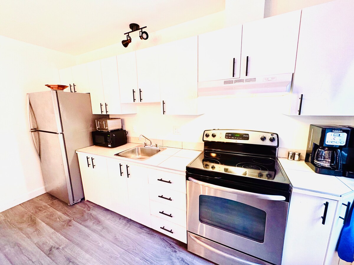 Très grand appartement 1300 pi2, lumineux au sous-sol. Fenêtres à la hauteur des épaules (demi-sous-sol). Cuisine bien équipée, salon avec foyer pour ambiance. 2 chambres, lit Queen chambre principale et lit double dans la deuxième. Lit escamotable Queen dans la salle à manger pour personnes suppl. Laveuse/sécheuse et douche en céramique. Stationnement gratuit longeant la maison vous sera réservé. Quartier tranquille à 10 min du Vieux Québec. Circuits d’autobus à proximité. CITQ no : 302470