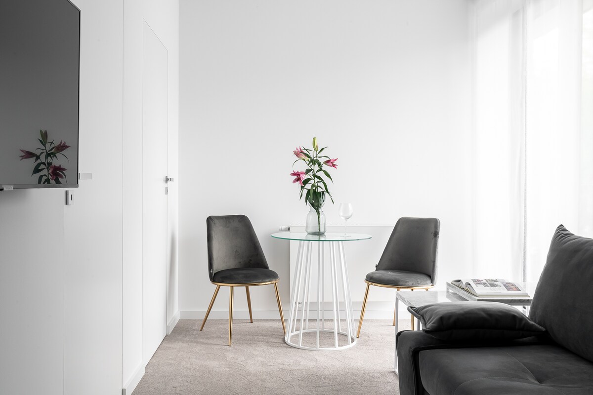 Klimatyzowany, piękny apartament na kondygnacji 0 typu Studio. Posiada salon z aneksem kuchennym, część sypialną z łóżkiem małżeńskim oraz łazienkę. Idealny dla młodych par z dzieckiem. Posiada osobne drzwi balkonowe z wyjściem na zewnątrz.