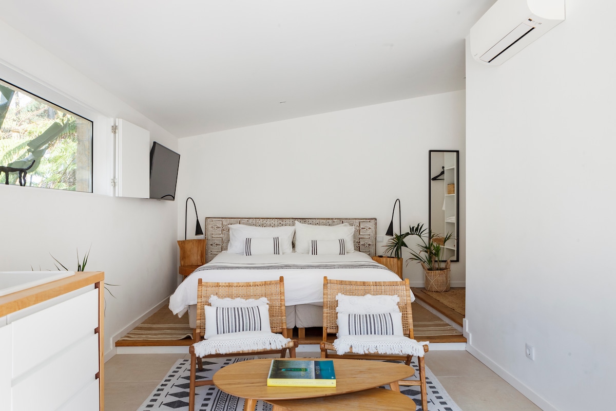 This Guest House located on the outskirts of Cascais Center, within walking distance to many restaurants, cafés, museums, beaches and a short 35-minute train ride to the center of Lisbon. Open-plan space, with a meter tall wood divider separating the living area with kitchenette from the bedroom, walls and closet covered in natural jute wallpaper, white marble bathroom with steam shower cabin. Our Guests are welcome to use the heated plunge pool at 32ºC all year round.