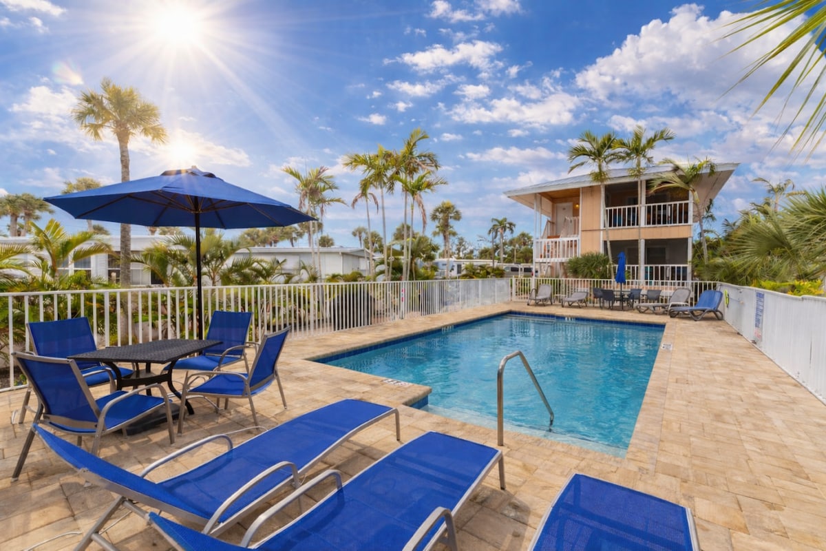"Florida's Best Beach". Views of the sunrise out the back screened-in porch overlooking the pond and amazing sunsets on the beach. Great amenities in the condo complex including free parking on the mainland, ferry, heated pool, and boat slip. Enjoy the sandy beaches by the provided golf cart! Please note: some other units nearby are currently under construction. Golf Cart provided at no additional cost and is operational (technician visits on Saturdays for any repairs needed)