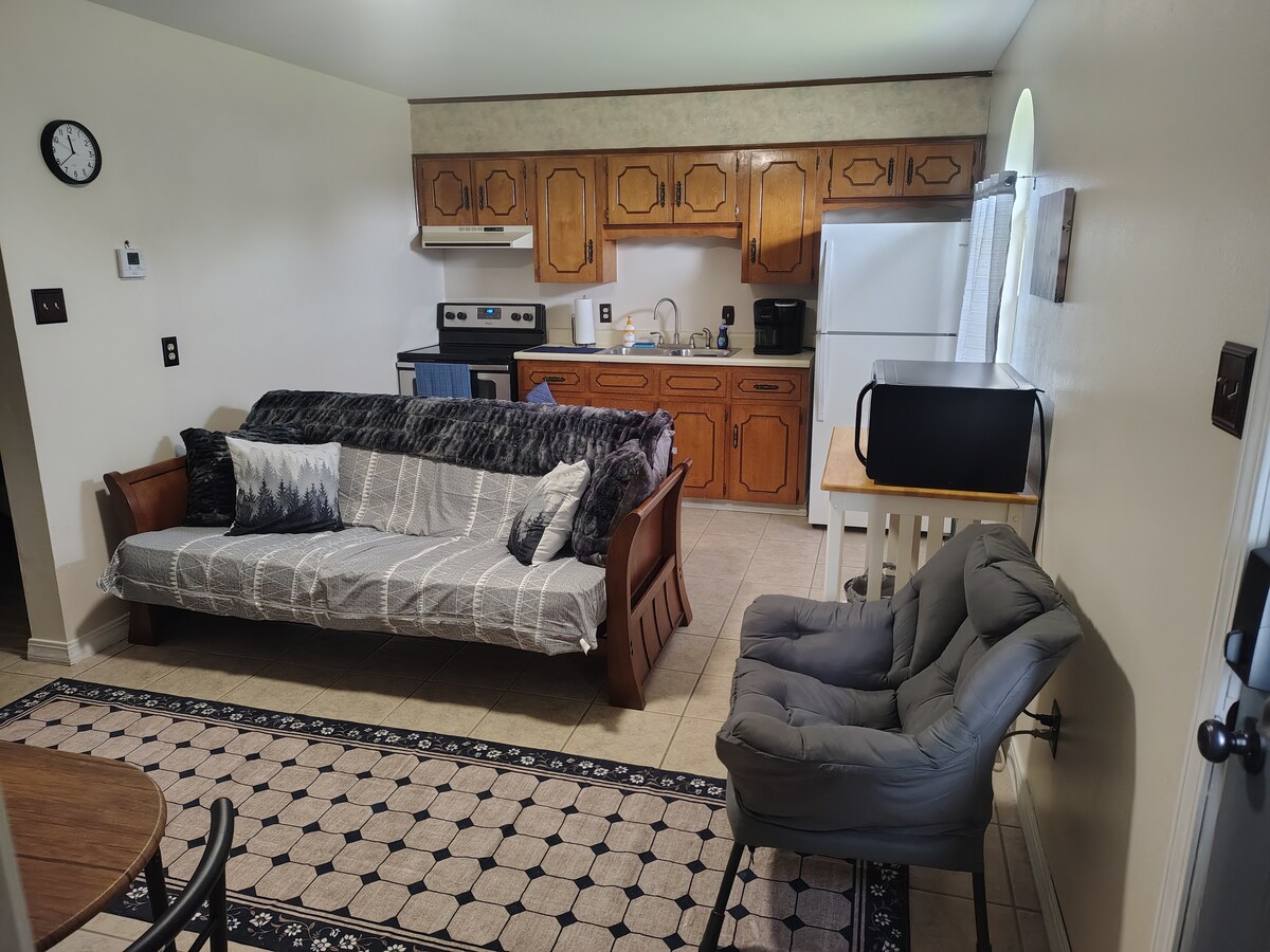 Απολαύστε ζεστή κομψότητα στο κατάλυμά μας με 1 υπνοδωμάτιο, που διαθέτει πλήρως εξοπλισμένη κουζίνα με γρανίτη, ένα άνετο κρεβάτι που υπόσχεται ξεκούραστες νύχτες και έναν γοητευτικό χώρο διαβίωσης. Ιδανικό για μεμονωμένους ταξιδιώτες ή ζευγάρια που αναζητούν μια ήρεμη απόδραση. Αν περνάτε μόνο για το βράδυ, απέχει 5 λεπτά με το αυτοκίνητο από τον αυτοκινητόδρομο, καθιστώντας το εύκολα προσβάσιμο. Καλώς ήρθατε σε ένα κομμάτι του παρελθόντος μας με όλες τις ανέσεις ενός σπιτιού. Το καταφύγιό σας σάς περιμένει!