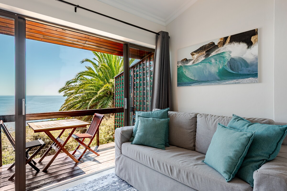 Το στούντιο διαμέρισμά μας ανοίγει σε ένα μπαλκόνι 40 τετραγωνικών μέτρων με πανοραμική θέα στην κοιλάδα Hout Bay και τα βουνά Helderberg. Οι μεγάλες συρόμενες πόρτες εξαφανίζονται στους τοίχους δημιουργώντας μια ανεμπόδιστη εσωτερική/εξωτερική ροή, ενώ η υπερυψωμένη θέση προστατεύει την ιδιωτικότητά σας. Το μπάνιο ανοιχτού τύπου βλέπει σε έναν κλειστό μυστικό κήπο που περιλαμβάνει ένα γυάλινο ντους χωρίς πλαίσιο. Το κατάλυμα διαθέτει πλήρως εξοπλισμένη μικρή κουζίνα και εξυπηρετείται καθημερινά εκτός Σαββατοκύριακων και αργιών.