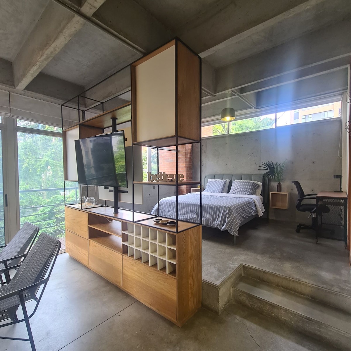 Spectacular duplex apartment in El Poblado, featuring a private jacuzzi as its centerpiece and a luxurious king-size bed for ultimate comfort. Designed with a rustic-modern aesthetic, it offers elegant wood finishes, warm lighting, and a cozy atmosphere. Every detail blends sophistication and relaxation from the fully equipped kitchen to the stylish living area and contemporary décor. A perfect retreat for design lovers seeking comfort, luxury, and an unforgettable stay in Medellín.
