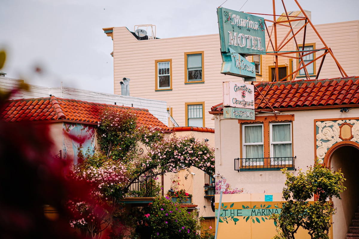 This beautifully appointed room opens into our flower-filled courtyard 🌸 and features two extra-long double beds 🛏️🛏️ (queen-length). Located in a small, family-run motel in the Marina District, near 🏙️ Cow Hollow and Chestnut Street’s shops and restaurants. Enjoy the walkable neighborhood and cozy stay. 🚗 Free parking upon availability—check with the front desk. 🐾 Not pet-friendly. 👥 Max occupancy: 4 guests. We look forward to welcoming you! 😊