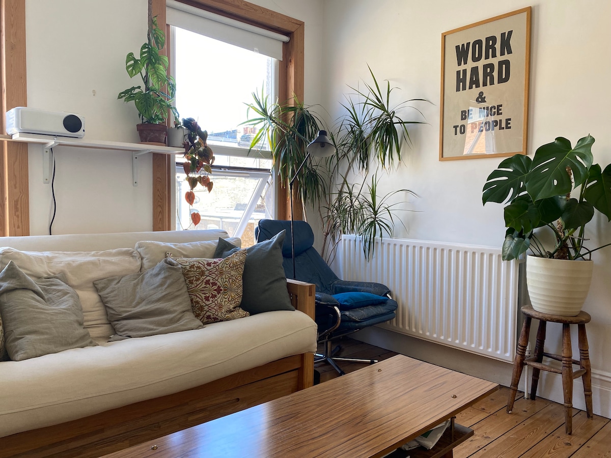 Στον τελευταίο όροφο ενός όμορφου βικτωριανού συγκροτήματος αρχοντικών, ανάμεσα στα μοντέρνα εστιατόρια και μπαρ του Dalston - κρυμμένο σε έναν παράδρομο, γεμάτο φυσικό φως και φυτά, αυτή είναι μια εξαιρετική βάση για να εξερευνήσετε από ένα μέρος για να αποδράσετε και να χαλαρώσετε!! Το αυτόνομο σαλόνι μετατρέπεται σε ένα άνετο δεύτερο υπνοδωμάτιο με διπλό κρεβάτι φουτόν (με ένα βαθύ, άνετο στρώμα). Ή κατεβάστε τα στόρια συσκότισης και φορτίστε τον προβολέα για να φτιάξετε μια υπέροχη αίθουσα κινηματογράφου! 1 ή 4 άτομα, είναι υπέροχο!